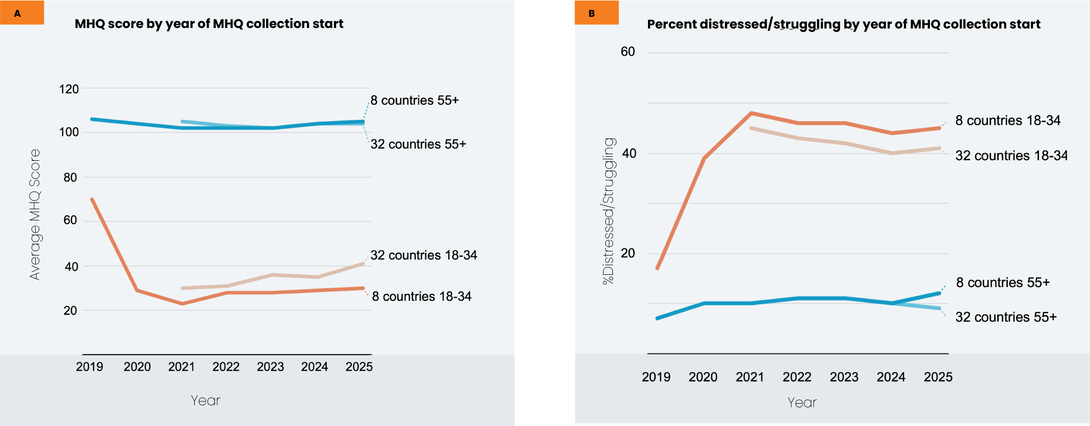 MHQ score declines and the percentage of distressed struggling increases with successively younger generations in both the US and India