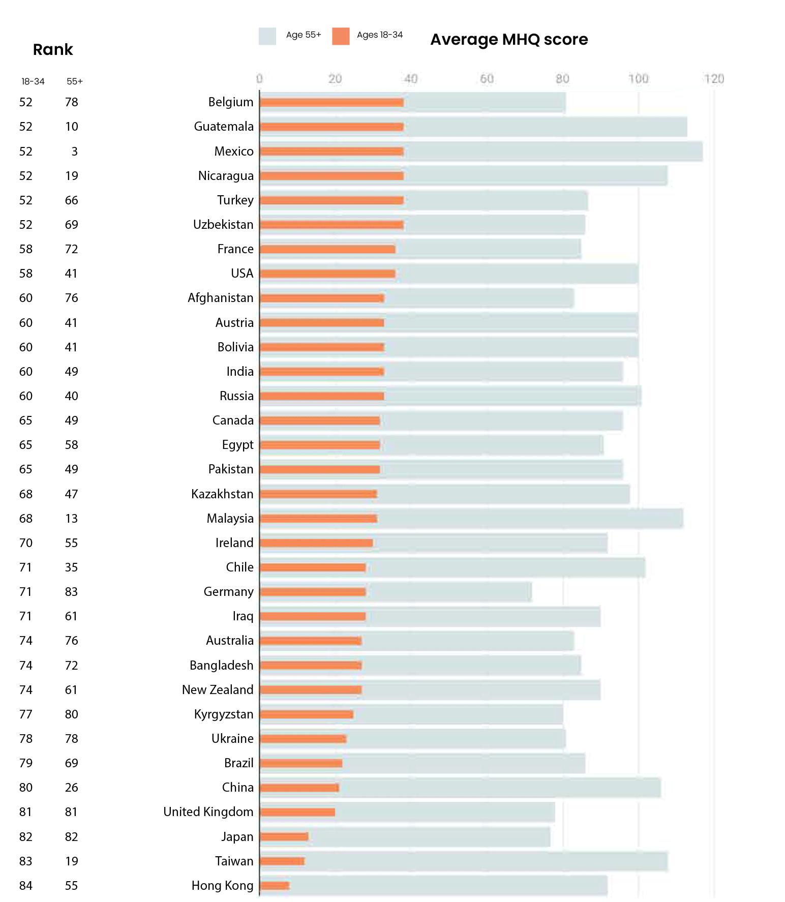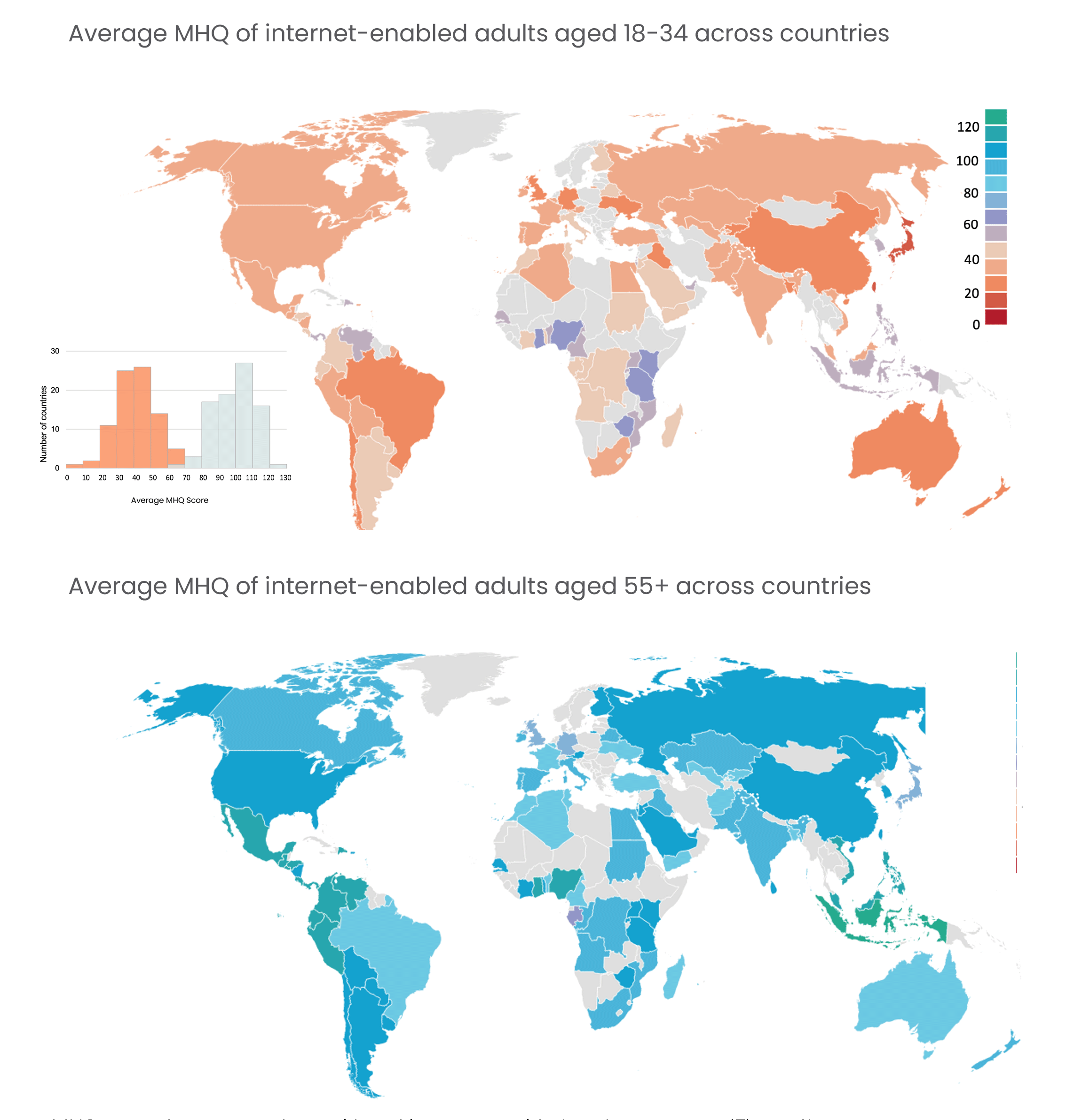 Globally, young adults are 3 to 4 times as likely to struggle with their mental health as their parents’ generation (Language groups)
