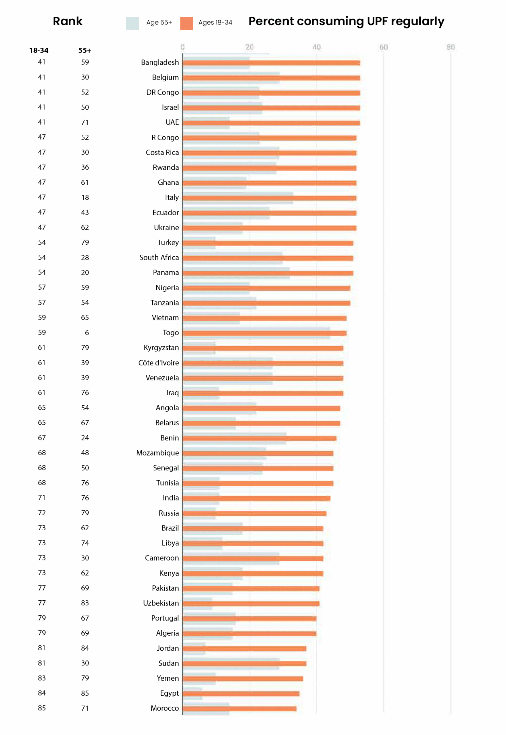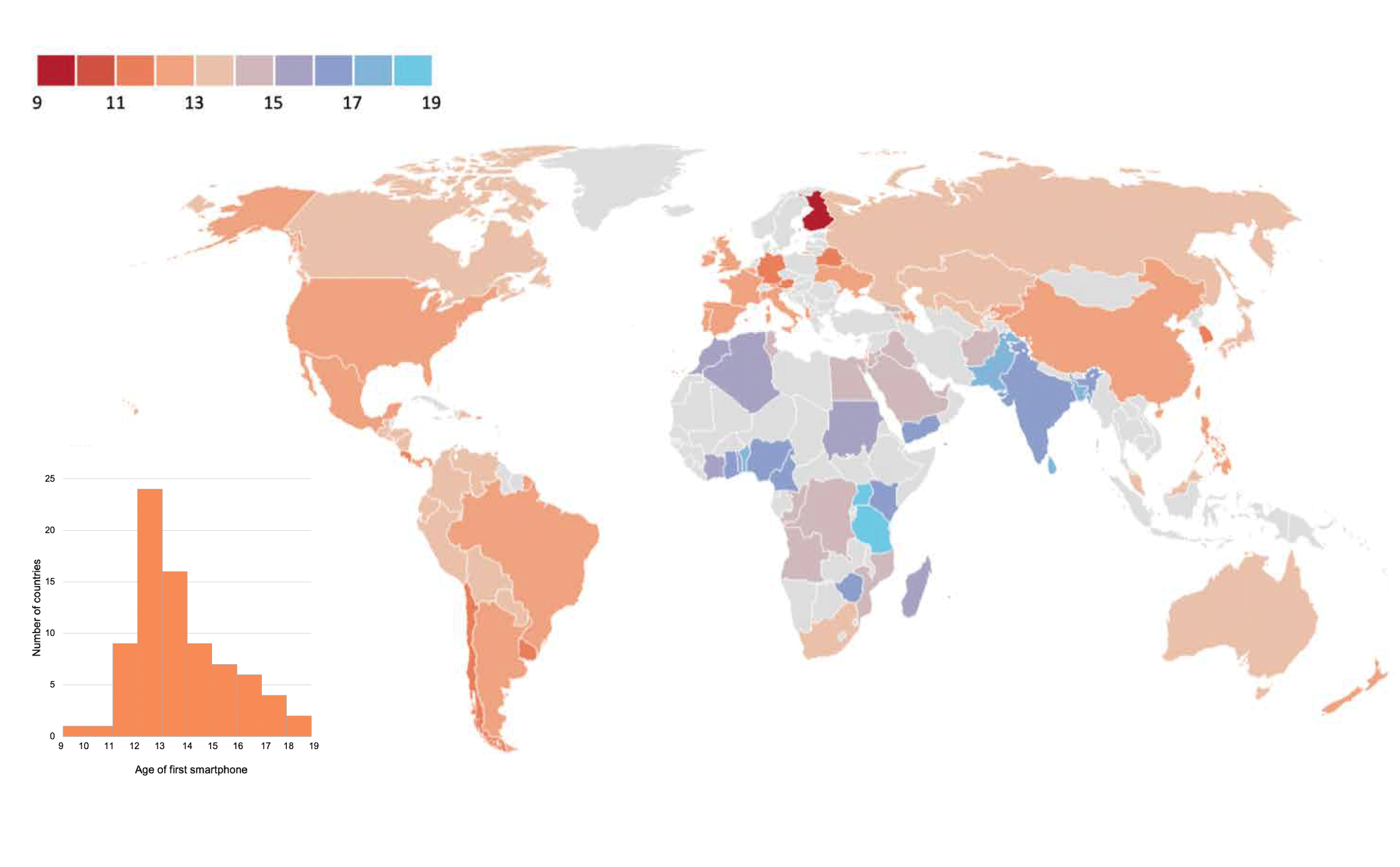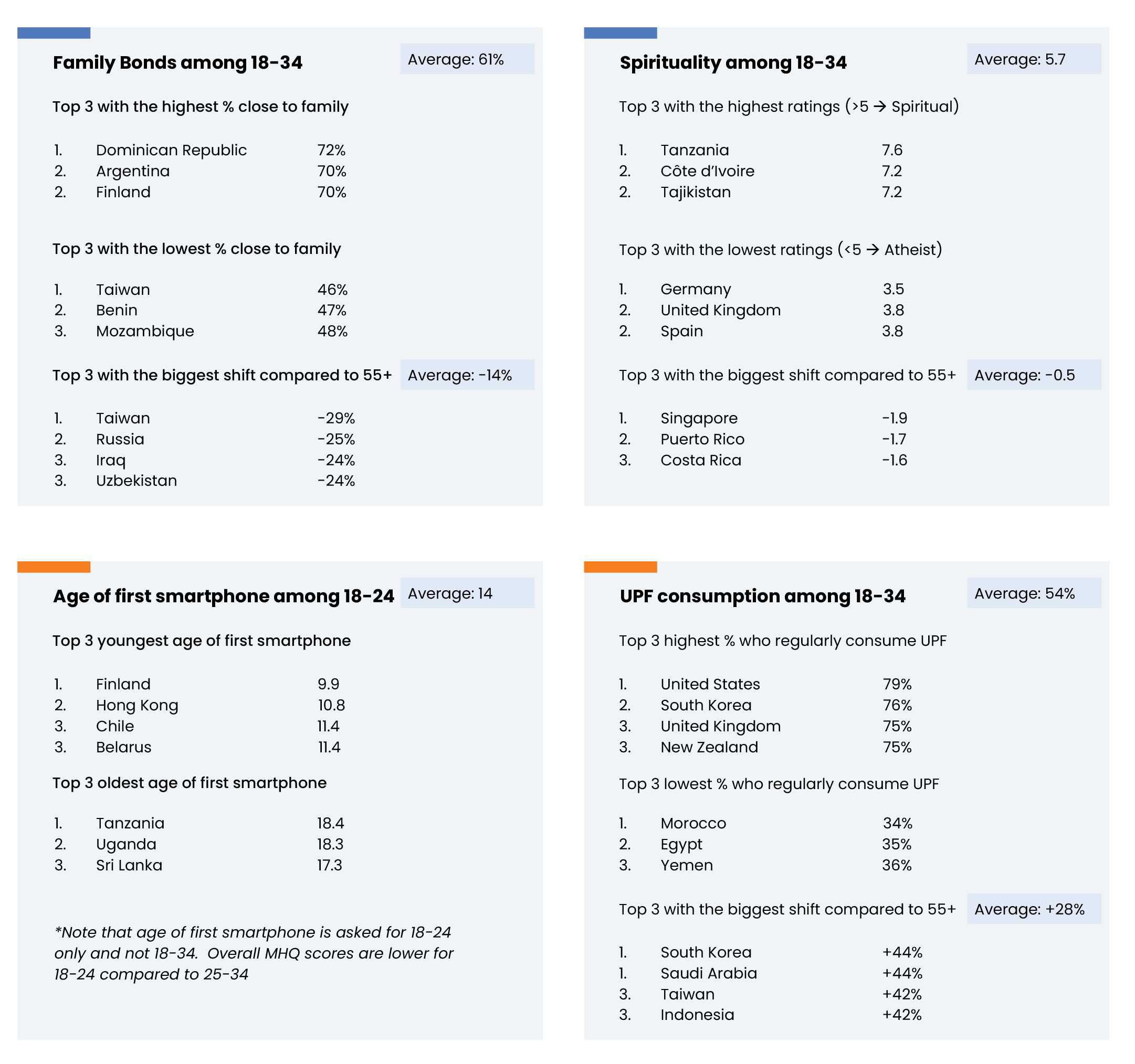 A snapshot of family bonds and spirituality scores, age of first smartphone ownership, and UPF consumption across countries and by age group