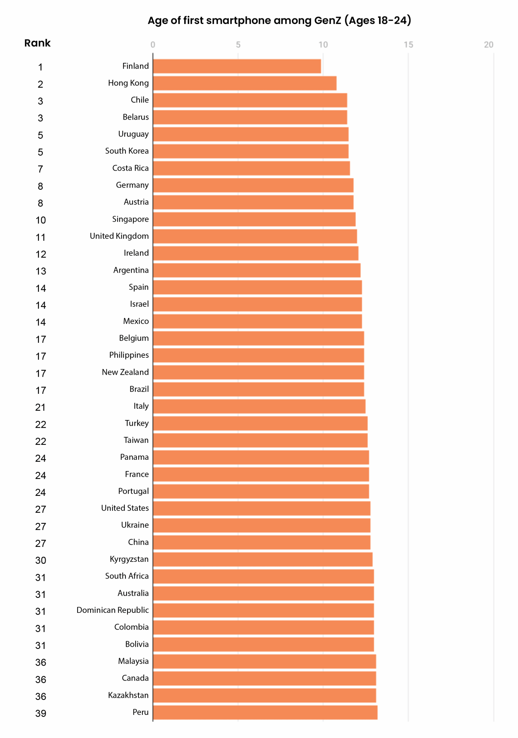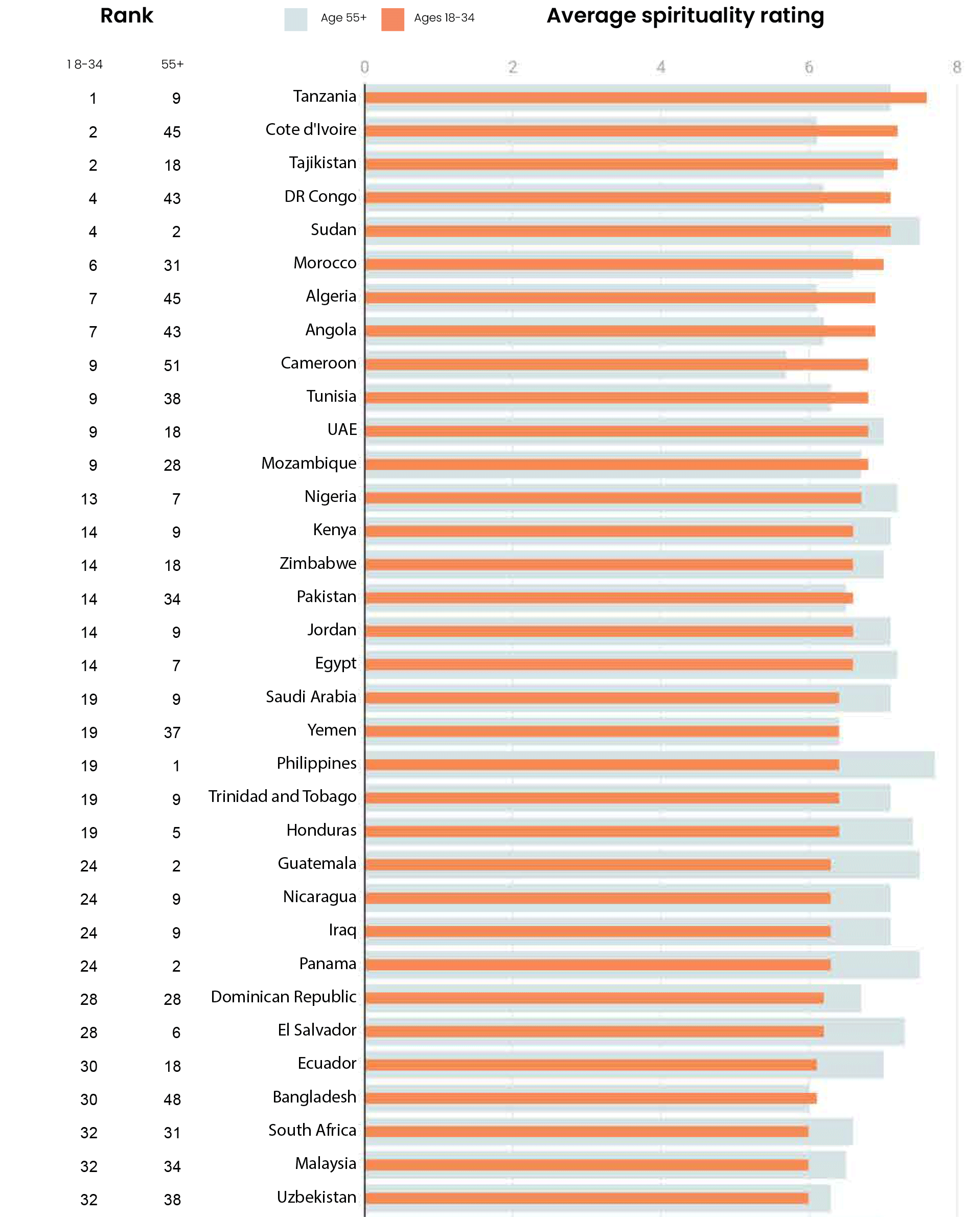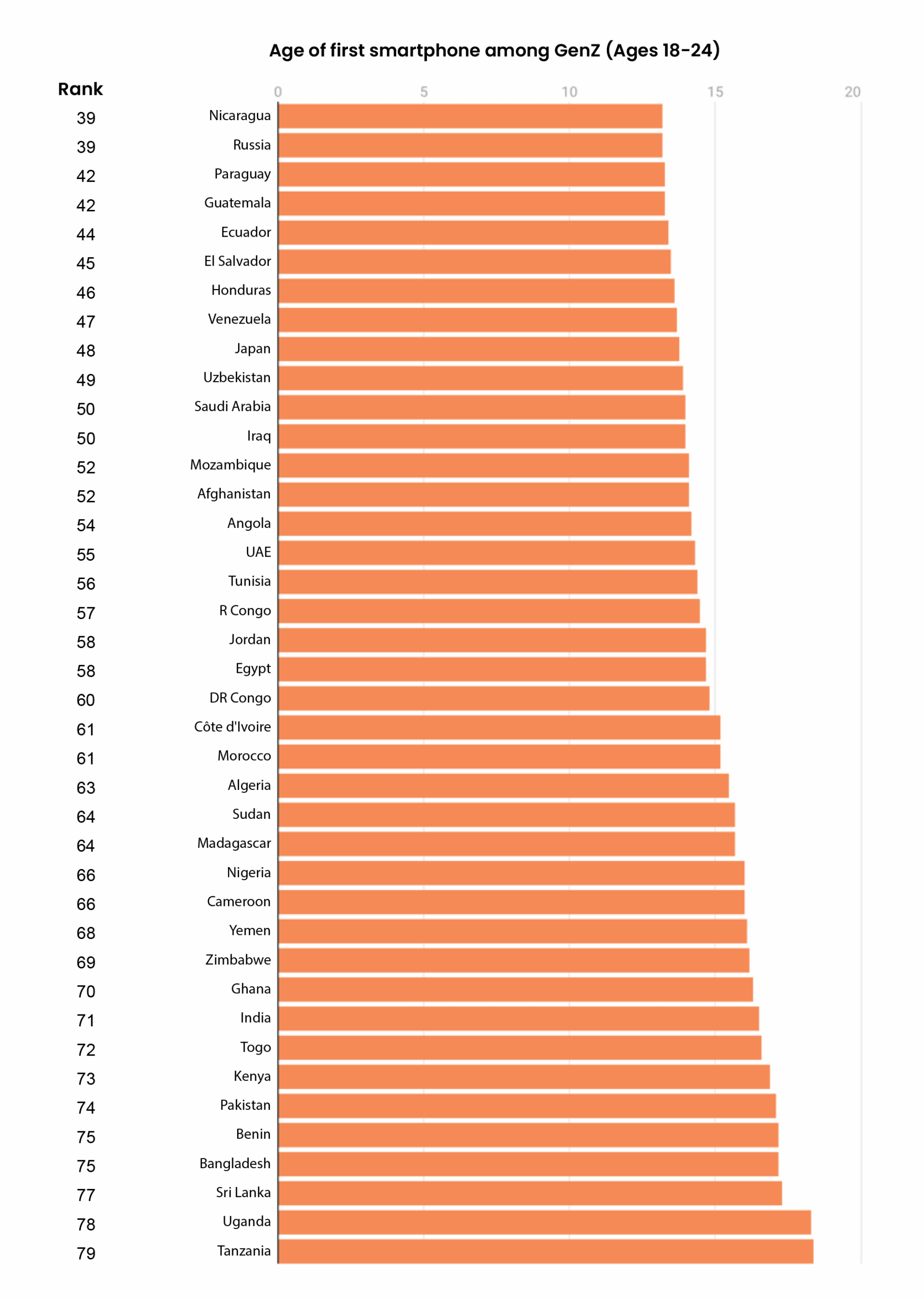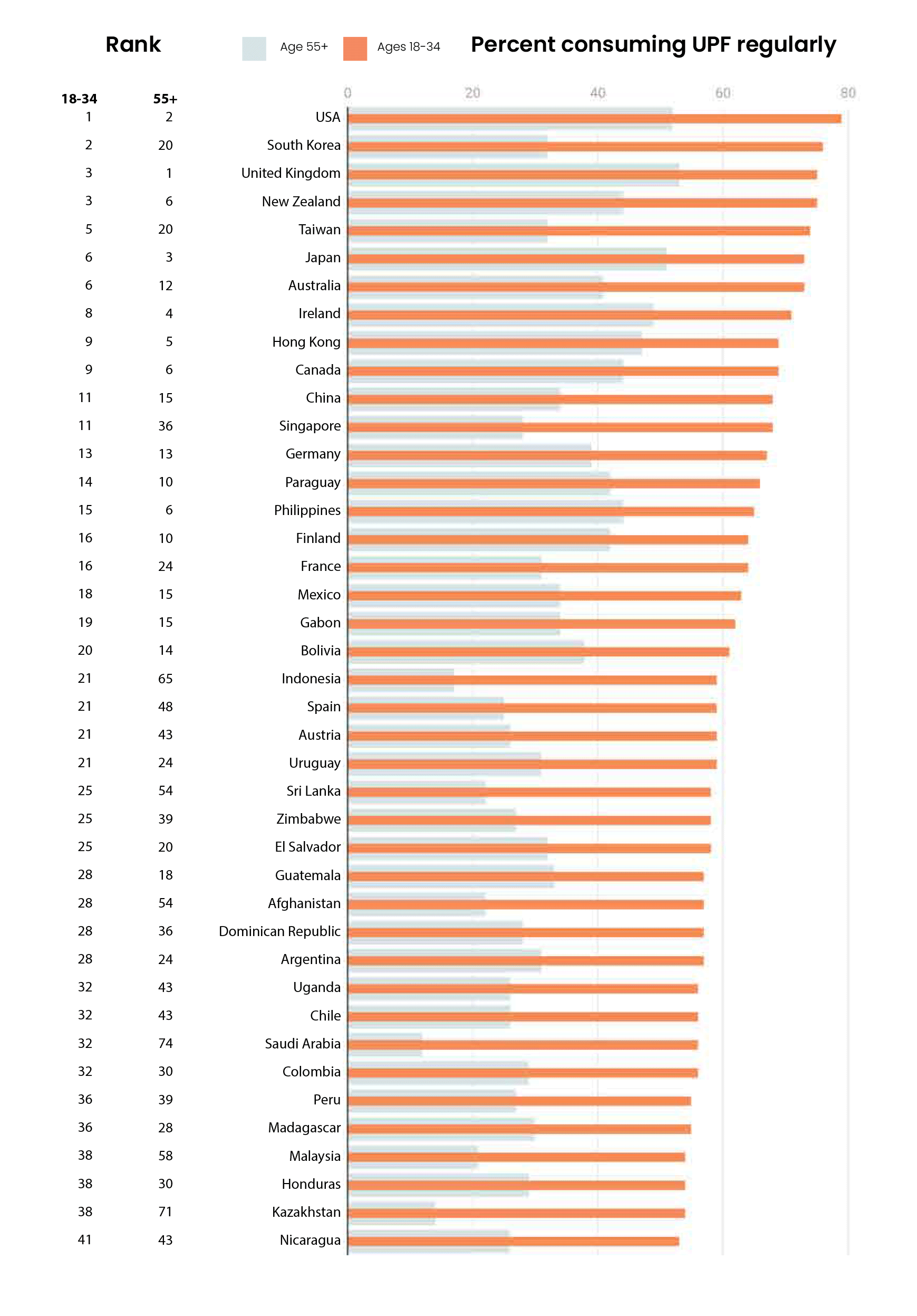 A snapshot of family bonds and spirituality scores, age of first smartphone ownership, and UPF consumption across countries and by age group