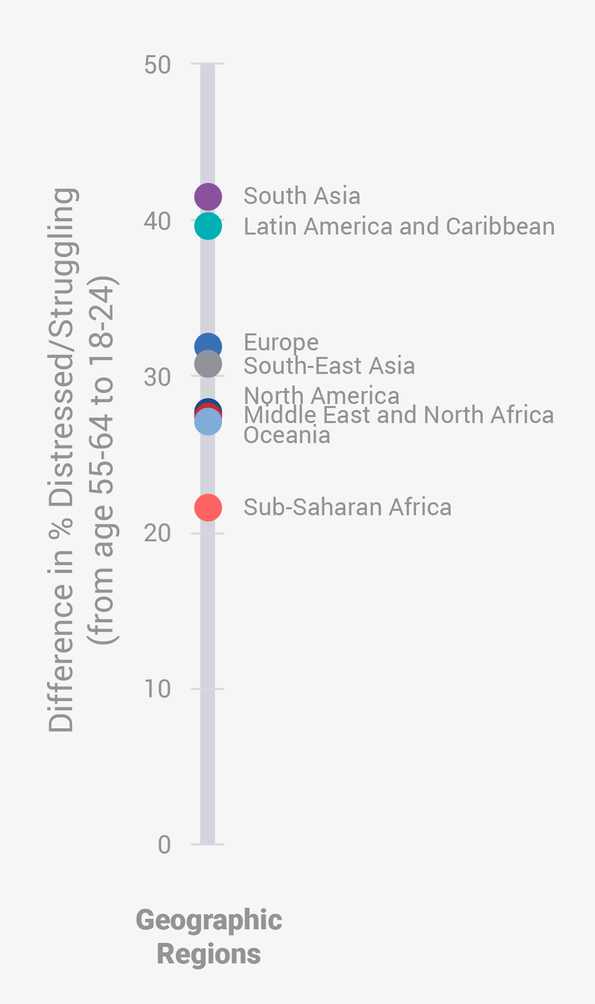 Difference in % Distressed or Struggling between older and younger adults across for Social Self – geographic regions