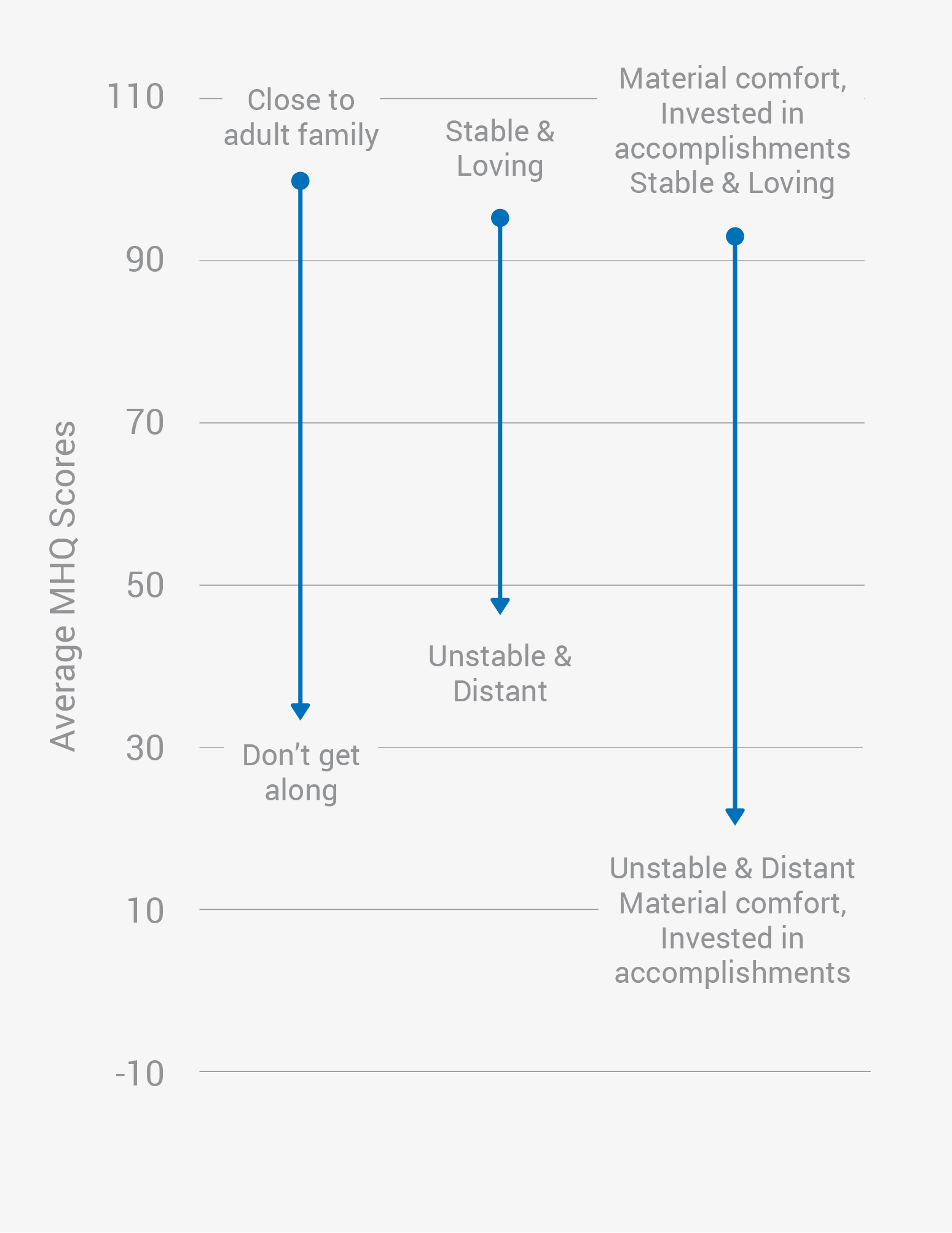Difference in mental wellbeing based on childhood home and adult family relationships – average MHQ score