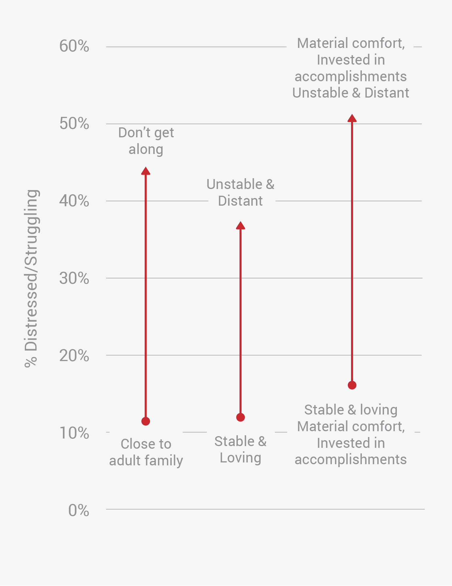 Difference in mental wellbeing based on childhood home and adult family relationships – % Distressed or Struggling