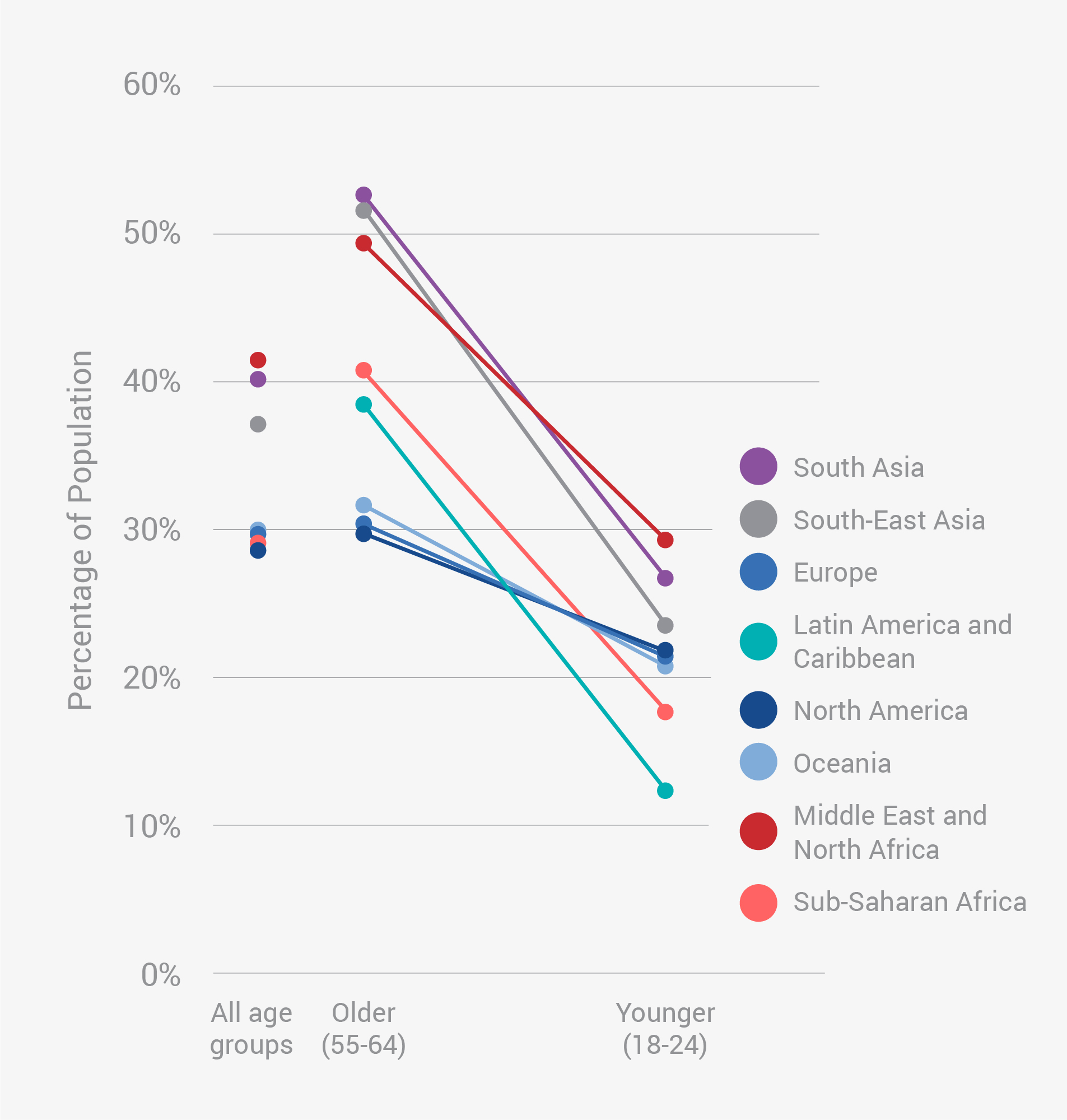 How the difference in family closeness between age groups varied across geographic regions