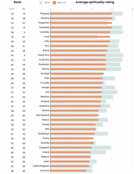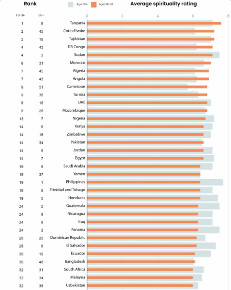 Average spirituality rating (Ages 18-34 and 55+) by country – b