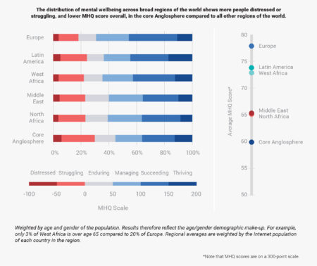 N: 223,087 Graphs showing the distribution of 5 different dimensions of mental well being across different global regions in 2021 as measured by the Mental…