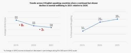 N: 223,087 Graphs showing the change in mental wellbeing status across English-speaking world between 2019 and 2022, as measured by the MHQ, a comprehensive measure…