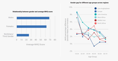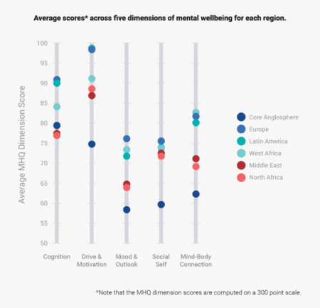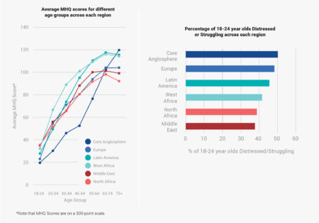 N: 223,087 Graphs showing the mental wellbeing of different regions around the world in 2021 as measured by the Mental Health Quotient (MHQ) a transdiagnostic…