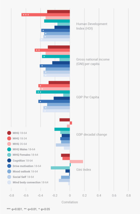 N: 223,087 Graph showing the relationship between mental wellbeing in internet-enabled populations, as measured by the Mental Health Quotient (MHQ) and global economic indicators such…
