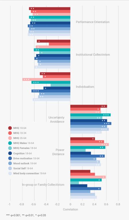 N: 223,087 Graph showing the relationship between mental wellbeing in internet-enabled populations, as measured by the Mental Health Quotient (MHQ) and cultural indicators. Results show…