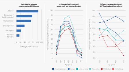 N: 223,087 Graphs showing the relationship between mental wellbeing status and employment status, globally and for different geographical regions. Mental wellbeing status determined using the…