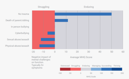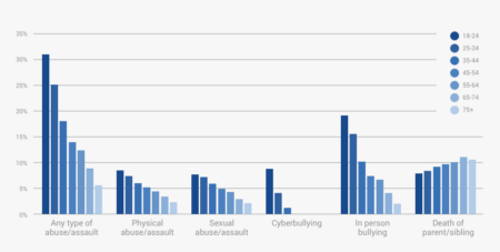 N: 286,732 Those who experienced childhood physical and sexual abuse or assault as well as cyberbullying had the worst mental wellbeing with negative average MHQ…