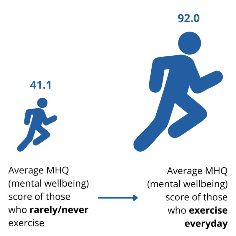 Mazoezi yana athari kubwa kwa ustawi wa akili. Wale ambao walifanya mazoezi ya dakika 30 kwa siku walikuwa na wastani wa MHQ (mgawo wa afya ya akili) ambayo ilikuwa pointi 46 juu kuliko wale ambao mara chache au hawakuwahi kufanya mazoezi. Soma zaidi kuhusu athari za mazoezi kwenye ustawi wa akili.