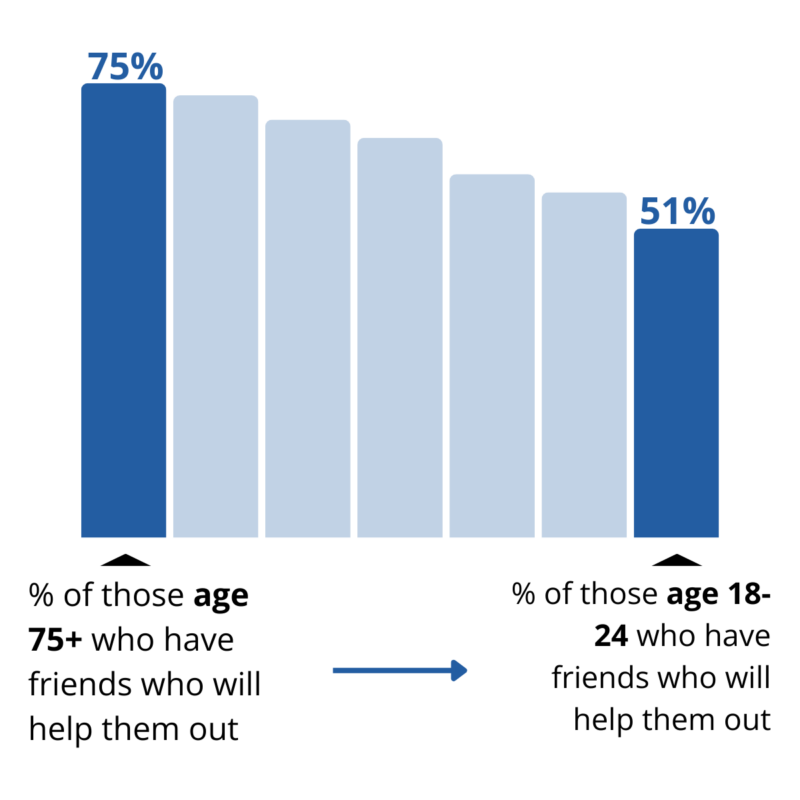 Kuna kupungua kwa vizazi katika idadi ya watu wanaoripoti kwamba walikuwa na marafiki ambao wangeweza kuwaamini au ambao wangewasaidia. Ni 64% tu ya watoto wa miaka 18-24 walikuwa na marafiki ambao wangeweza kuwaamini, na ni 51% tu walikuwa na marafiki ambao wangewasaidia.