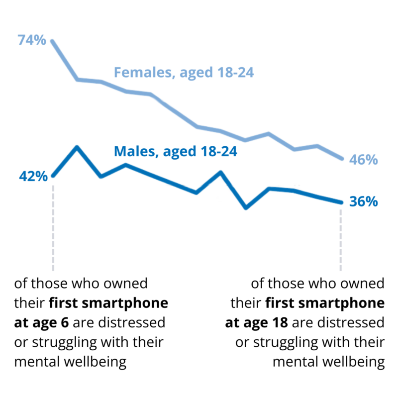 Ustawi wa akili unaboresha mara kwa mara na umri mkubwa wa umiliki wa kwanza wa smartphone au kompyuta kibao, haswa kati ya wanawake. Sababu moja inayowezekana ya hali hii? Takwimu zinaonyesha kuwa “ubinafsi wa kijamii,” jinsi tunavyojiona na kuhusiana na wengine, uliboreshwa sana na shida na mawazo ya kujiua yalipungua sana na umri mkubwa wa umiliki wa smartphone ya kwanza.